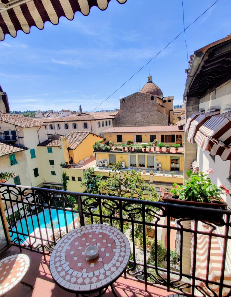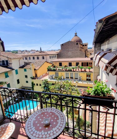 There are plenty of comfortable, clean hotels in Florence, with luxury and budget-friendly options scattered throughout the city. I am partial to Hotel Croce di Malta. I prefer this hotel for its proximity to the train station (Firenze Santa Maria Novella), a vibrant piazza, good eats, and famous attractions. I stayed in a balcony room overlooking the turquoise pool and the city. Not only was it very clean and comfy, but the staff were helpful, and the included buffet breakfast was delectable. The highlight of this hotel is the rooftop terrace and bar, which offers panoramic city views, drinks and snacks, and a mellow ambience with music.